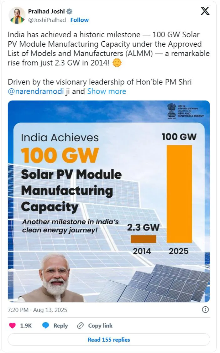Prahad Joshi, ministrul Alianței Indiene pentru Energie Regenerabilă Nouă, a subliniat această realizare, declarând: „India a atins o piatră de hotar istorică - în conformitate cu Lista de modele și producători aprobate (ALMM), capacitatea de producție a modulelor solare fotovoltaice a ajuns la 100 de gigawați, o creștere semnificativă de la 2,3 gigawați în 2014, sub conducerea vizionară a premierului Nădraren! iniţiative precum Schema de stimulare legată de producția de module solare eficiente (PLI), India construiește un ecosistem de producție solară puternic și autosuficient. Această realizare va spori ritmul către Atmanirbhar Bharat și va ajuta India să-și atingă obiectivul de a atinge 500 de gigawați de capacitate de producere a energiei nefosili până în 2030.